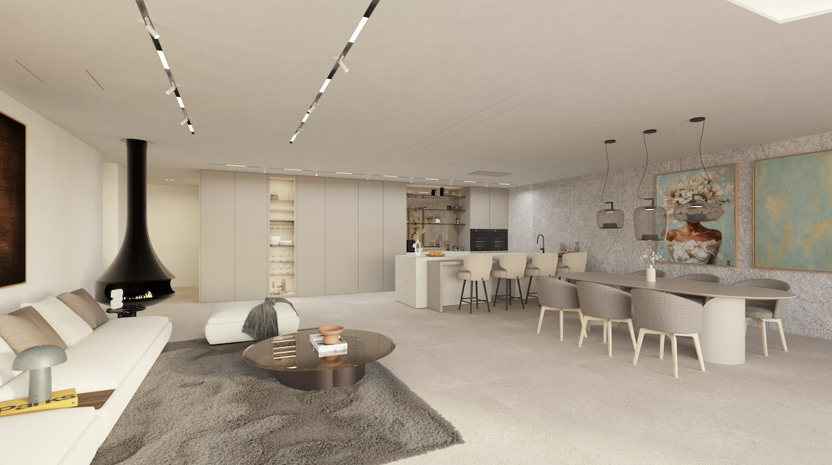 The open-plan living and dining area features a stylish fireplace and floor-to-ceiling sliding doors opening onto a sun-drenched pool terrace. When fully opened, the interior seamlessly blends with the outdoor spaces, where the infinity pool and spacious sun terrace form the centrepiece of the Mediterranean garden.